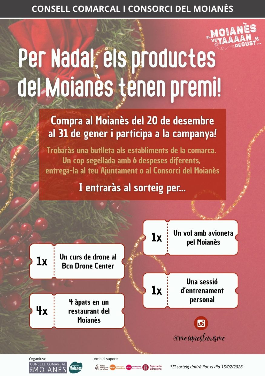Demà, dissabte 20 de desembre, inicia la campanya de Nadal “Per Nadal, els productes del Moianès tenen premi!”, una iniciativa impulsada pel Consorci del Moianès per potenciar el comerç local i el consum de productes de proximitat durant les festes nadalenques. La campanya estarà activa del 20 de desembre al 31 de gener i convida la ciutadania a comprar als establiments de […]